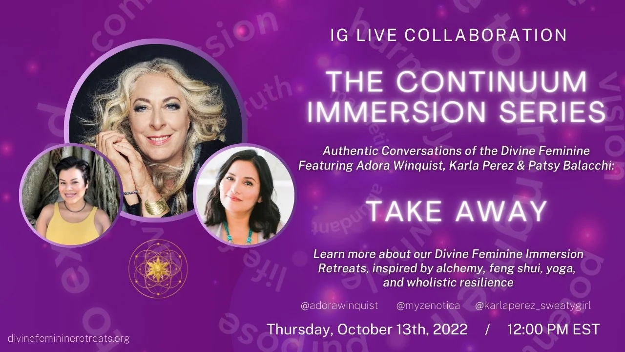 Join our IG Live Immersion this week to discover all the accessible practices of Aromatherapy, Feng Shui, and Yoga you will TAKE AWAY from our Divine Feminine Immersion Retreat. Join us for authentic discussion and practical tips to integrate greater harmony, balance and energy in your daily life.